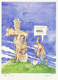 Titre de l'album: Devinez qui on enterre demain? version de luxe. Tirage: 300 ex. signés et numérotés Par "Loup éditions" . Impression: sérigraphie couleurs |